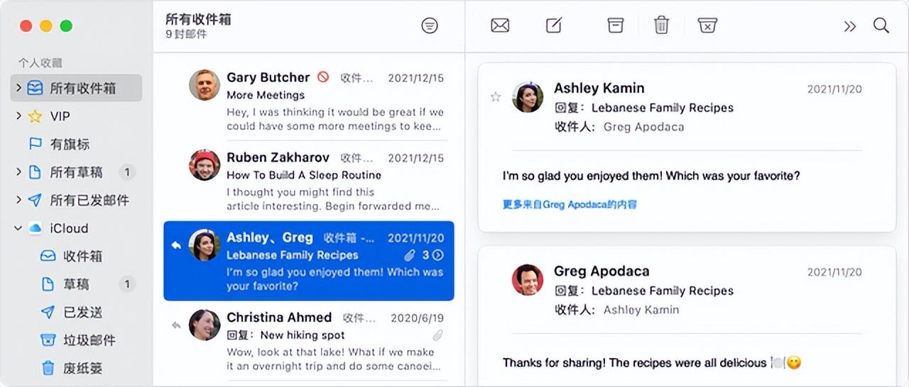 2、打開【郵件】應用,點擊【郵箱】>【清除垃圾郵件】,如果要刪除已移入廢紙簍的郵件,請選取【郵箱】>【清除已刪除項目】。