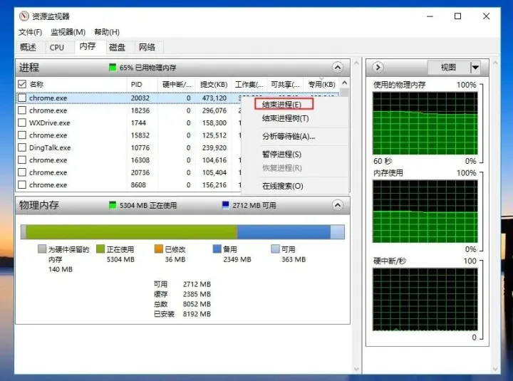 3、然后我們查看哪一行占用比例比較高,再點擊窗口下方的【打開資源監控器】,進入“資源監控器”后選中占用比較高的一行,右鍵“結束進程”就可以了。