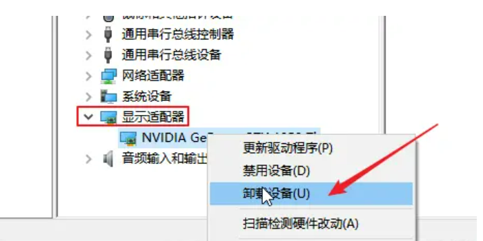 3、找到“顯示適配器”展開右擊顯卡驅動程序,選擇“卸載設備"。接著重啟電腦屏幕就可以正常顯示了。