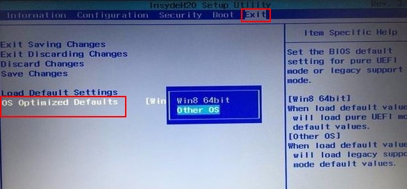進入Exit-選擇OSOptimizedDefaults,系統類型選擇win864bit表示UEFI;otherOS或Disabled表示Legacy。