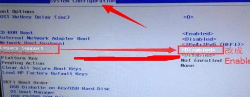 4、進到計算機bios后切換至系統配備界面,改動Legacy Support為Disabled。應用UEFI模式重新啟動,進到系統修復報錯界面。