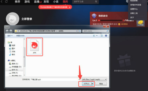 2、在彈出的窗口中,點擊解壓后的APK文件,然后點擊打開;