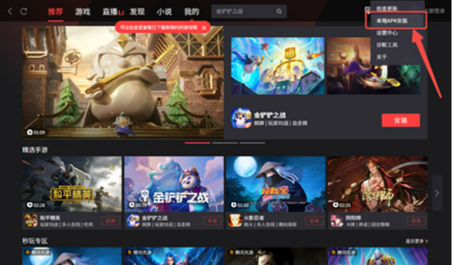 1、下載騰訊手游助手,下載安裝完成后,進入模擬器主界面,點擊右上角圖標選擇“本地APK安裝”按鈕;