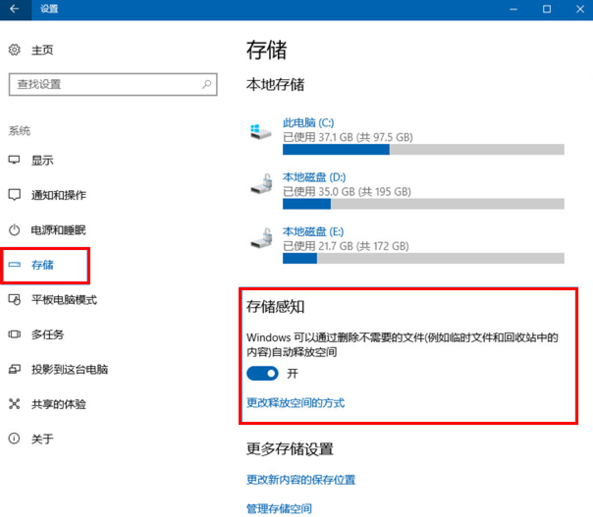 2、然后選擇存儲,將存儲感知下的按鈕打開,Windows即可成功通過刪除不需要的文件自動釋放空間。