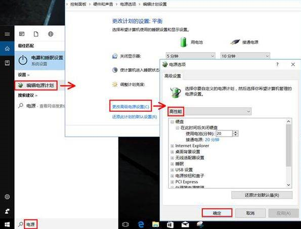 1、點擊桌面左下角的搜索圖標,搜索并依次點擊【編輯電源計劃】-【更改高級電源設置】,在高級設置下,設置為高性能,點擊確定。