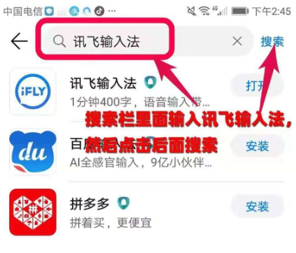 2、打開應用市場以后,在最上方的搜索欄里面輸入“訊飛輸入法”,點擊搜索。