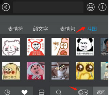 2、進入表情界面,選擇斗圖,在斗圖表情包界面,點擊下方的表情off,將斗圖開啟即可。