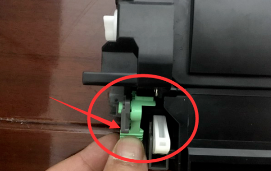 5、將新粉盒放進原來的鼓盒里,輕輕按下去,直到左側的綠色卡字卡好即可。