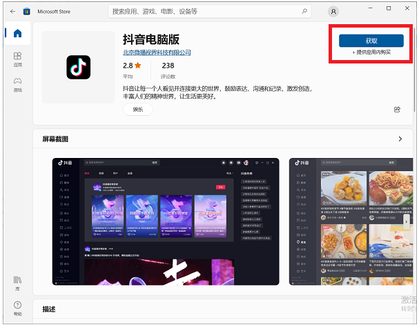 2、在應用界面,點擊右上角的【獲取】就可以下載抖音電腦版在電腦桌面上安裝了。