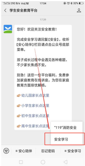 2.關注后點擊右下角菜單欄的“安全學習”—“安全學習”進行登錄;