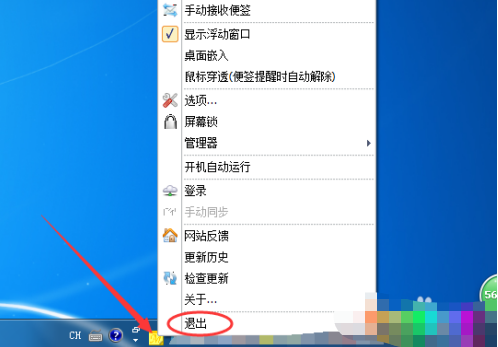 6、如何退出桌面便簽程序呢?又擊任務欄右邊上的圖標,出現一個快捷菜單,點擊退出就能退出程序。至于每個功能的具體用法,大家可以一個一個的試一遍,直到完全了解為止。