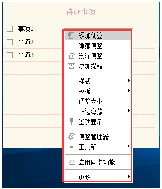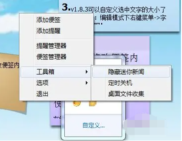 4、在待辦事項的便簽中,可以雙擊事項,就可以輸入待辦的工作,同時也可以鼠標右鍵點擊標簽,然后會彈出菜單欄,如下圖所示,可以添加便簽、隱藏便簽、刪除便簽等,這里有著很多的功能選項都可以體驗。