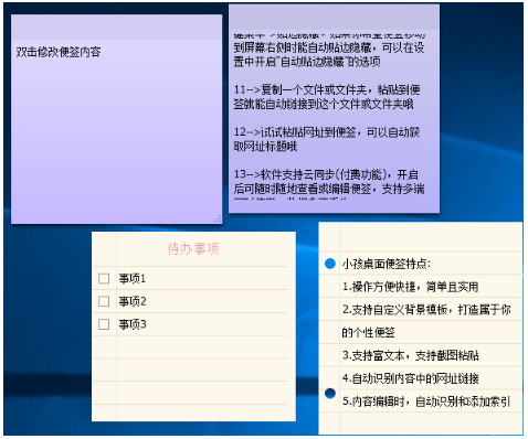 1、首先打開小孩桌面便簽軟件后,會出現三個小便利貼,一個是待辦事項,一個是使用引導,還有一個是便簽特點。我們可以按住鍵盤上的Ctrl+鼠標左鍵來拖動便簽,這樣就能拖出一個新的便簽。