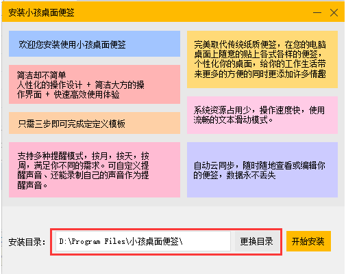1、首先自行在網上查找并下載小孩桌面便簽軟件包,然后解壓文件運行exe安裝文件,選擇軟件安裝的位置,默認是安裝到c盤,一般建議點擊更改目錄選擇其他的安裝位置。