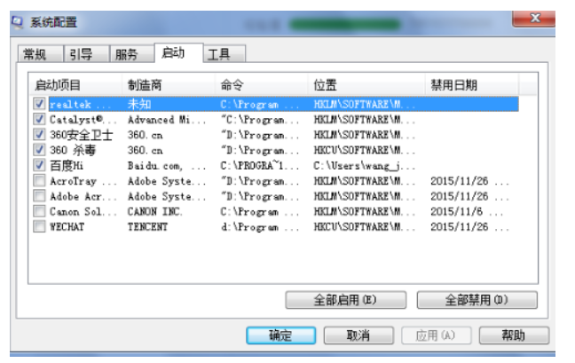 2、電腦彈出系統配置對話框,可以選擇啟動,禁用不需要的進程。