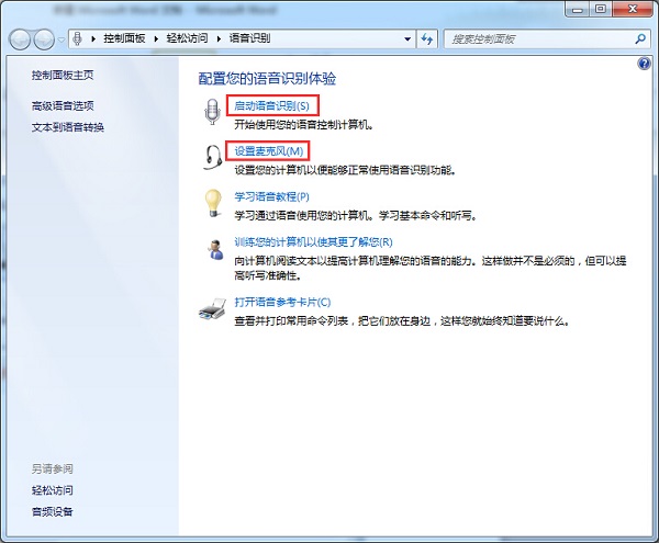 3、 在這個聲音界面上,大家可查看麥克風是不是默認設置正確了,沒有的話可在下方修改默認值。同時,我們點擊“配置”選項,則是會出來“語音識別”界面。在這里大家可進行“啟動語音識別”或“設置麥克風”,小編設備有限就不跟大家一一介紹了。