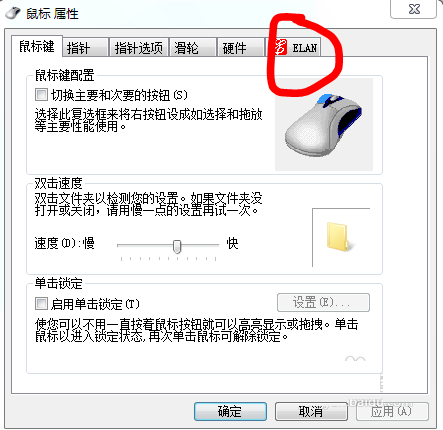 3、 接著在打開的鼠標屬性界面里,切換到“ELAN”欄目。