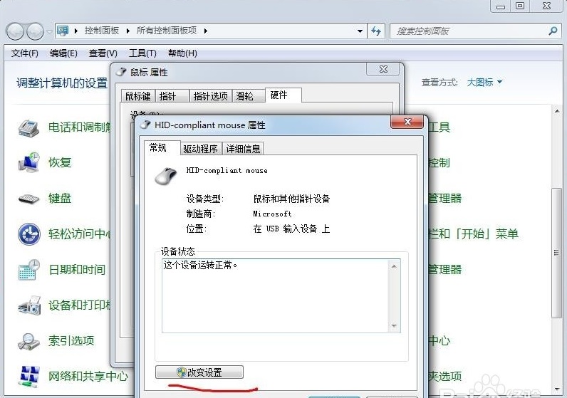 3、 按回車或鼠標雙擊打開鼠標屬性,然后切換到硬件欄目。