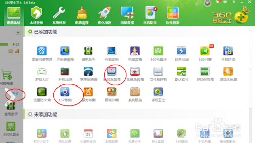 五、假如以上多種方法都不能排除本地連接正在獲取網絡地址,那么就有可能是電腦中毒,以及一些未知沖突,可以下載安裝360安全衛士、金山毒霸等殺毒軟件,這里以360安全衛士9.6beta為例——>打開360安全衛士窗口——>單擊“更多”——>選擇“斷網急救箱”或者“LSP修復”,建議在斷網急救箱無法解決的情況下選擇LSP修復(PS:建議使用這種方式來解決問題,一鍵式解決)