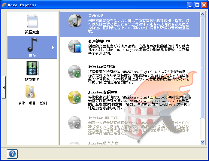 1、 首先大家打開Nero軟件,并且選擇“音樂”欄目里面的“音樂光盤”選項。