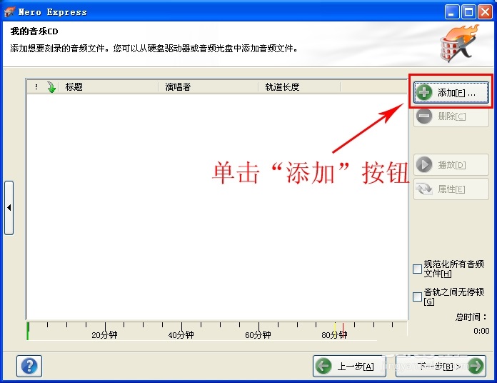 2、 選擇好之后,此時會有一個添加的窗口出現,大家點擊“添加”按鈕。將下載好的音樂文件拖到空白處里面,音樂cd光盤盡量使用mp3或是wma或是wav格式。界面下方有CD光盤容量大小,是根據音樂時長來計算的,這里注意不要超過黃色警戒線。
