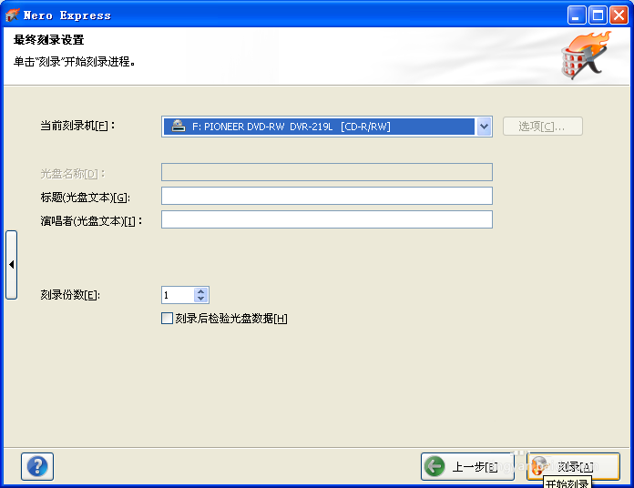 4、此時選擇你電腦上的刻錄機,其他默認設置也是可以的,然后點擊刻錄按鈕,開始進行刻錄。