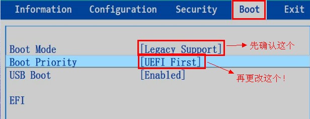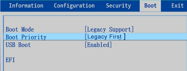 然后移動到“Boot Priority”選項,按回車鍵將里面的UEFI First”選擇更換為這個“Legacy First”。