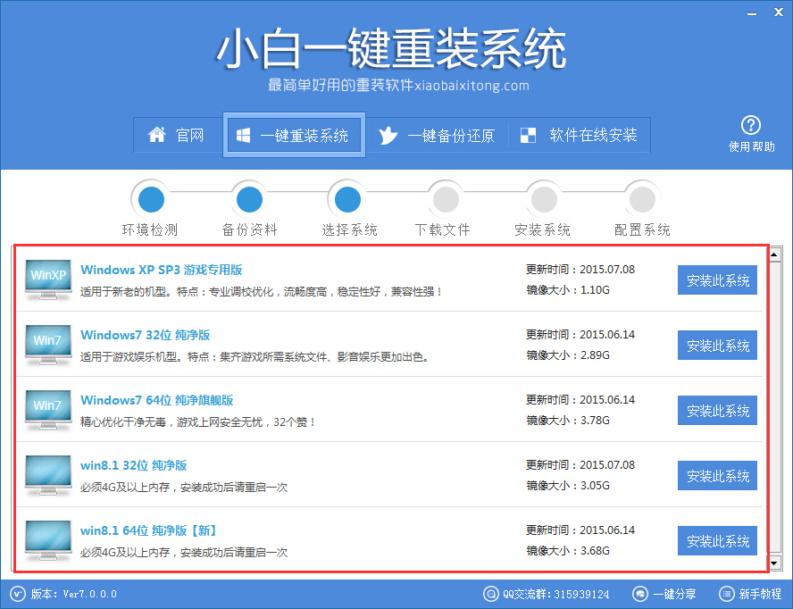 4、 接下來到了這個“選擇系統”界面,這里有各種不同版本的系統可供大家選擇。這也是為什么說這個小白一鍵重裝系統軟件是個不錯的選擇了。它還幫大家分析了各種版本系統的主要特點。