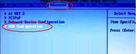 2、接著進入BIOS后使用鍵盤上的右方向鍵找到“Advanced”選項,最下面的“USB Configuration”選項并點擊回車進入。