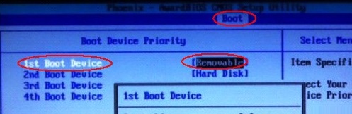 5、然后在“Boot Devicepriority”設置窗口中選擇“1st Boot Device”選項并點擊回車。然后在彈出的“1st Boot Device”選項中選擇“Removable”選項。