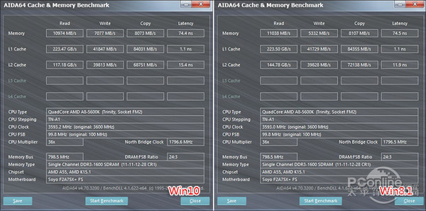 小結:從最終結果來看,Win10的內存占用要明顯大于Win8.1,尤其是5分鐘后的自動回收情況遠不及上一代產品。從內存基準測試來看,Win10僅在“內存寫”(Memory Write)這一項上略強于Win8.1,其余項目(Memory Read、Memory Copy、L1 Cache、L2 Cache)均呈現近似或不同程度的變慢。也就是說在內存實際利用率上,Win10并不及它的老前輩——Win8.1。