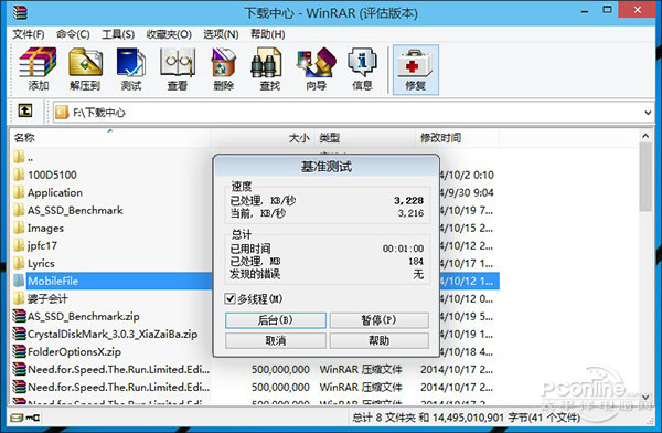 小結:WinRAR內置了一項簡易的壓/解壓縮測試模塊,支持多線程,可以方便地對CPU多線程及內存性能做一個評估。從測試結果來看,Win10的結果還是比較理想的,基準數據比Win8.1高出約13個點。