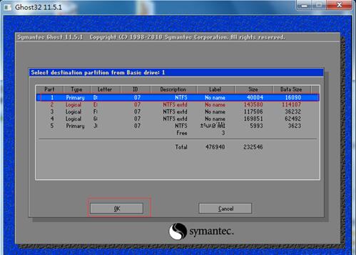 9、選擇你想把系統安裝到里面的那個盤,然后點OK,這個不能點錯,點錯了其他盤的數據就沒有了。
