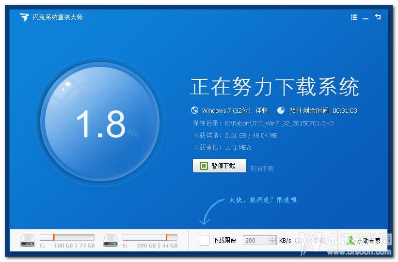 3、接著,閃兔系統重裝大師工具接著會下載智能云匹配的操作系統,windows7系統下載大約需要30-60分鐘,請耐心等待。如圖三