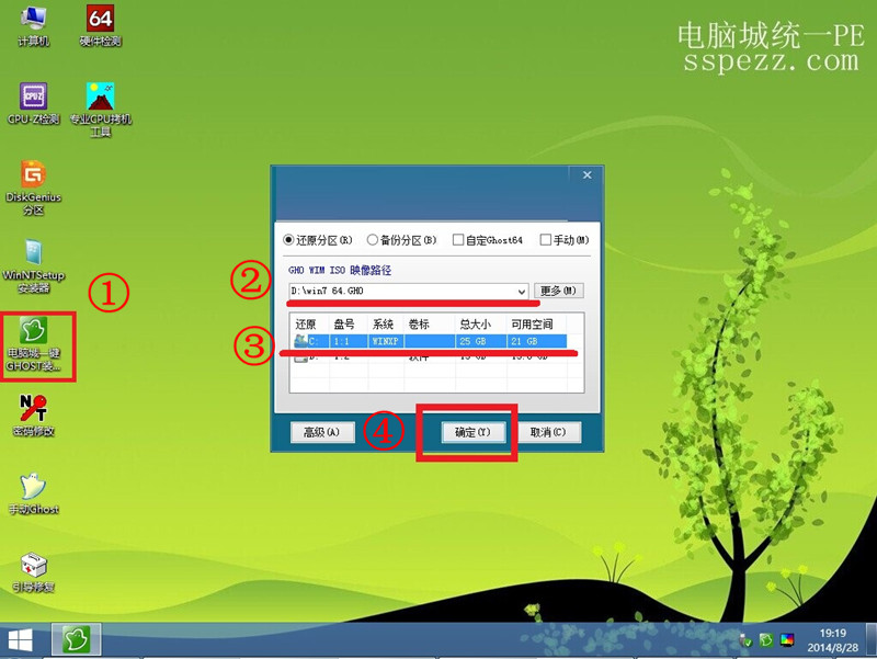 4、運行桌面的電腦城一鍵GHOST裝機 如下圖 選擇系統文件路徑 、安裝到C盤 、確定即可