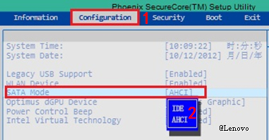 2、進入 BIOS 設置界面后,使用光標鍵選擇“Configuration”菜單(有機型描述為 Advanced ),將 SATA Mode 更改為“IDE”(有機型描述為Compatiable)模式后回車。如下圖所示: