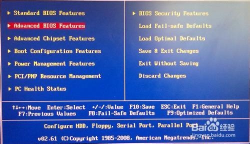 4.開機后,出現畫面快速按下“Delete”鍵進入BIOS畫面,按方向鍵“↓”選擇“Advance BIOS Features”然后再按Enter鍵。接下來畫面請看圖,按方向鍵“↓”選擇“First Boot Device”再按Enter鍵彈出一個長方形框,按方向鍵移動到“USB HDD”再按Enter鍵,然后再按“F10”鍵保存。