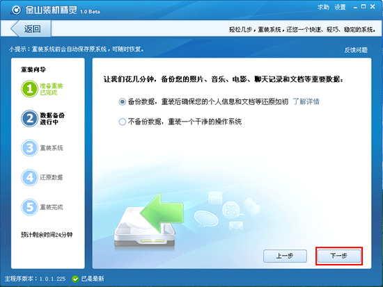 重裝系統完成,電腦重啟后進入桌面,自動啟動金山裝機精靈。點擊“下一步”,進行數據還原。