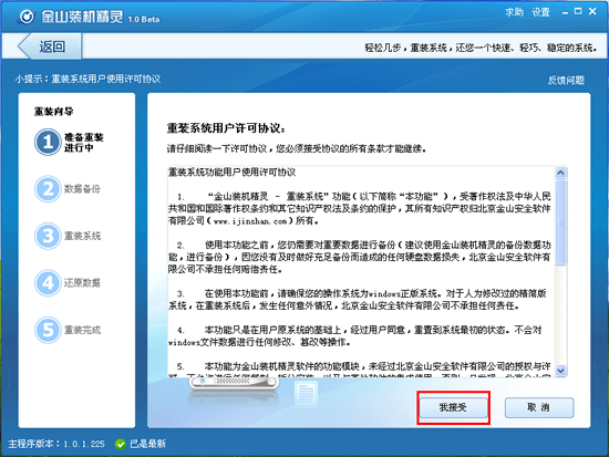 第一步:打開“金山裝機精靈”,選擇“重裝系統”,進入系統重裝界面,第一次使用電腦重裝系統功能,需要認真閱讀重裝系統用戶許可協議: