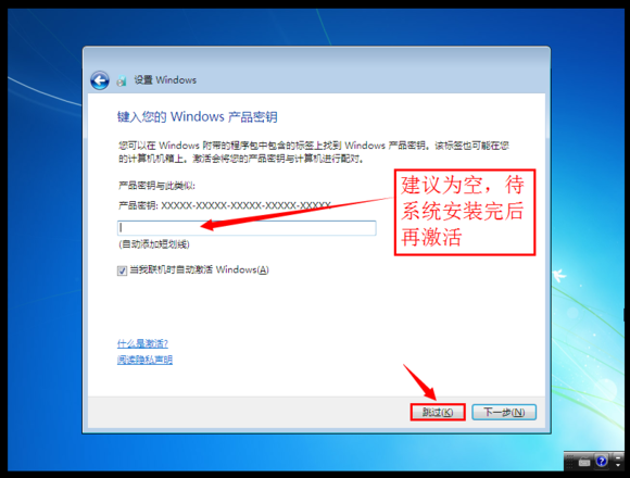 第15步:激活密鑰,建議為空,待系統安裝完后再激活