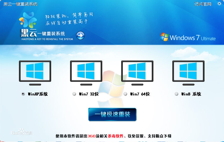 黑云一鍵重裝系統工具是一款可以一鍵重裝系統xp/win7/win8的系統重裝軟件,簡單易操作的系統重裝步驟讓任何沒有技術基礎的用戶都能自己完成系統重裝。
