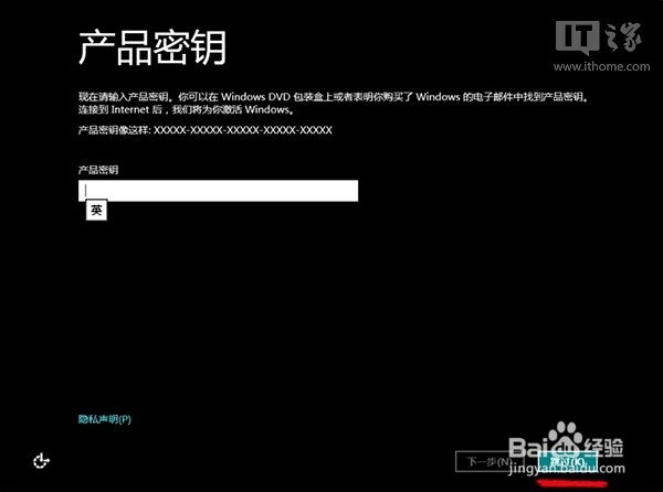 五、最后,在系統安裝過程中,我們可以直接跳過安裝密鑰輸入環節