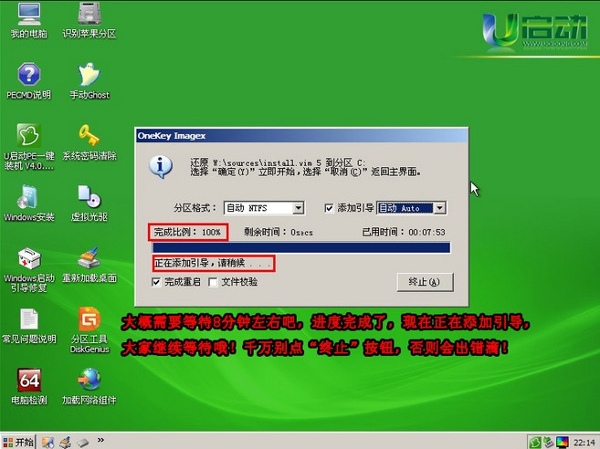 大概需要等待8分鐘左右就完成,完成后軟件自動添加引導,我們繼續等待,切勿點終止按鈕!如下圖所示: