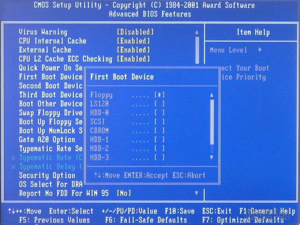 4、將“First Boot Device”項設置為“CDROM”即光盤,“Second Boot Device”項設置為“HDD-0”即默認硬盤。設置方法∶選“First Boot Device”項按“Enter”回車鍵。