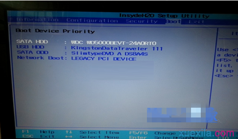 5、這里在鍵盤按下F5/F6鍵或鍵盤方向鍵進行上下切換,把“USB HDD”切換到第一選項,設置完成之后在鍵盤按下F10保存并重新啟動;
