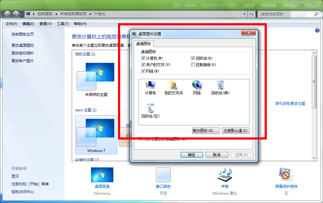 第十三步、進入win7系統桌面后,右鍵“個性化”-“更改桌面圖標”,將下圖所示的常用桌面圖標勾選上
