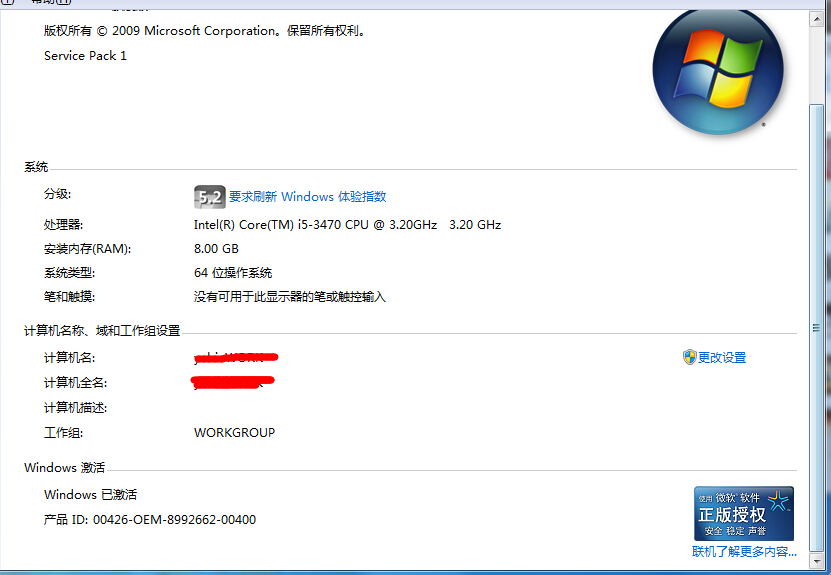 第十五步、再次在桌面右鍵“計算機”-“屬性”查看,顯示系統已經激活為正版,到此為止電腦重裝系統圓滿完成!