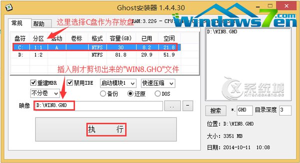 5、雙擊“安裝系統.exe”,選擇“C盤”(C盤為系統磁盤),插入映像文件“WIN8.GHO”,接著點擊執行,如圖所示: