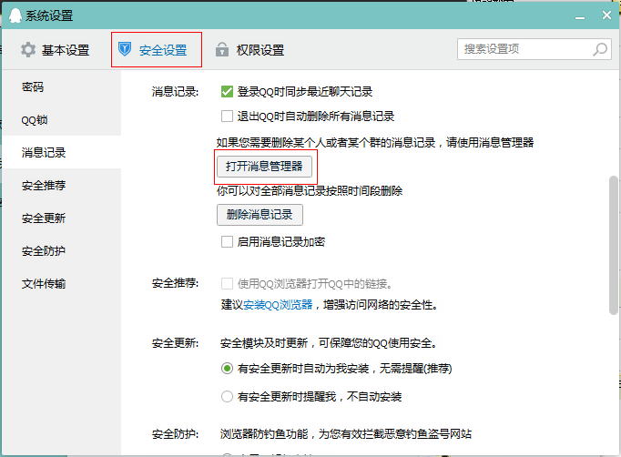 2.在系統設置面板里點擊”安全設置“,在安全設置欄目下找到”打開消息管理器“,然后點擊進入