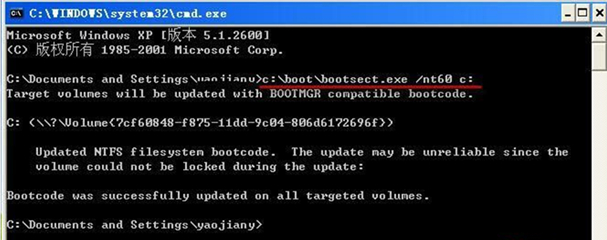 1、在XP系統中點擊開始→運行,填入CMD命令然后按回車,在命令行窗口鍵入,c:\boot\bootsect.exe /nt60 c: 命令并按回車。